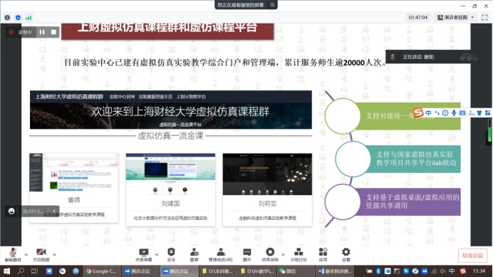 谢斐副主任从全校实验体系搭建者和国家级“金课”建设者两个角度,先后介绍了国家级虚拟仿真一流课程申报动向、《区块链金融》虚仿课程建设经验、国家级虚仿一流课程申报历程、上财虚拟仿真课程群和虚仿课程平台建设现状等多方面的内容。谢斐副主任的报告精彩纷呈,既有顶层设计的逻辑思考,又有课程建设的实践细节,既有对经验的系统总结,又有对未来的科学规划,引发了参会者的强烈共鸣和热烈讨论,使大家受益匪浅。