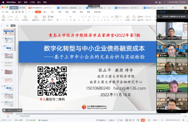 2022年11月16日晚上19:00,北京工商大学taptap点点体育、北京工商大学数字金融研究中心张正平教授受邀线上为全院师生做名为《数字化转型与中小企业债务融资成本:基于上市中小企业的文本分析与实证检验》的学术报告。