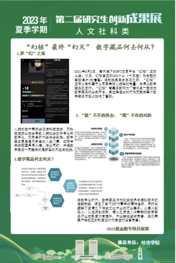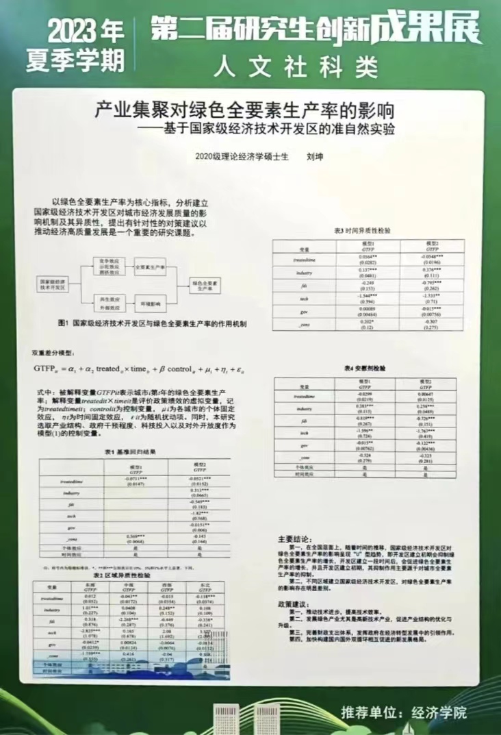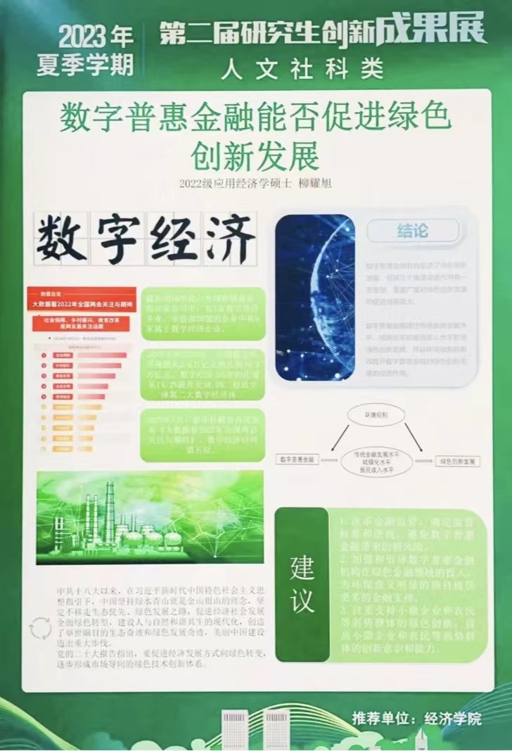 会后评审团专家从taptap点点体育研究生20余项代表性创新成果中评出了“校优秀学术海报奖”和“院优秀学术海报奖”。其中,《长期护理保险对中老年人心理健康的影响》和《基于中介效应模型的地区财富对绿色技术创新影响研究》获评校优秀学术海报奖,《数字普惠金融能否促进绿色创新发展》等19个成果获评院优秀学术海报奖。让我们一睹思想碰撞的火花。