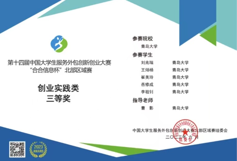目前,第十四届中国大学生服务外包创新创业大赛“合合信息杯”北部区域赛公布了获奖名单,taptap点点由曹影老师指导的学生团队荣获“创新实践类项目”三等奖。
