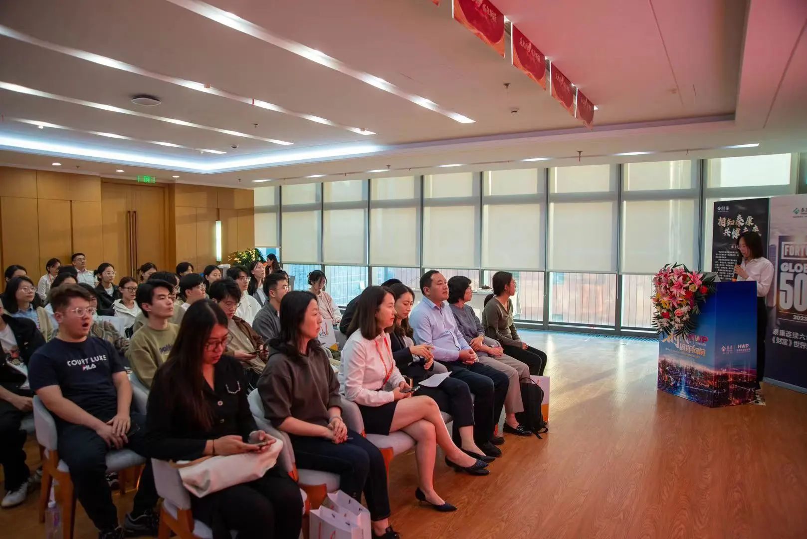10月24日下午,taptap点点体育党委书记邱建国、教师刘学宁、辅导员周小昀、曹影、程漫漫以及25名保险学硕士生一行赴泰康人寿青岛分公司开展访企拓岗行动。