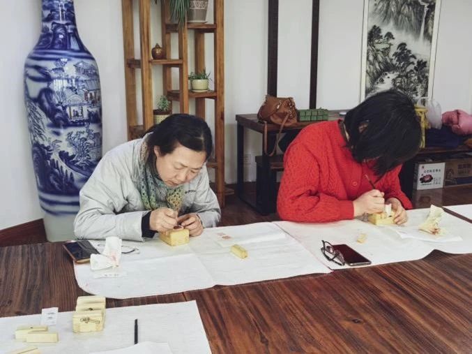 大家跃跃欲试,满怀热情,乐在其中。按照徐老师讲解的步骤,在徐老师的指导下,拿起刻刀,在印石上一笔一划、一丝不苟的篆刻,逐渐领悟了篆刻的基本技巧,完成了个人姓名名章的篆刻。