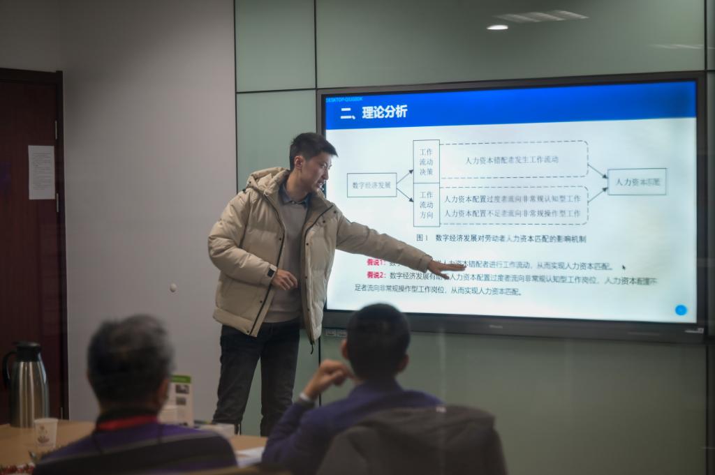 “数字经济”分会场由高斌、杨晨姊主持,本组报告探讨了数字金融与借贷约束的关系,市场整合对数实融合的促进作用,长期护理保险制度对家庭创业的影响,智能制造政策对企业“脱虚向实”的助力,以及“双碳”目标下稳就业的可能性。王沈南和黄迈指出这些研究揭示了数字经济如何塑造现代经济结构,并对政策制定提供了参考意见。