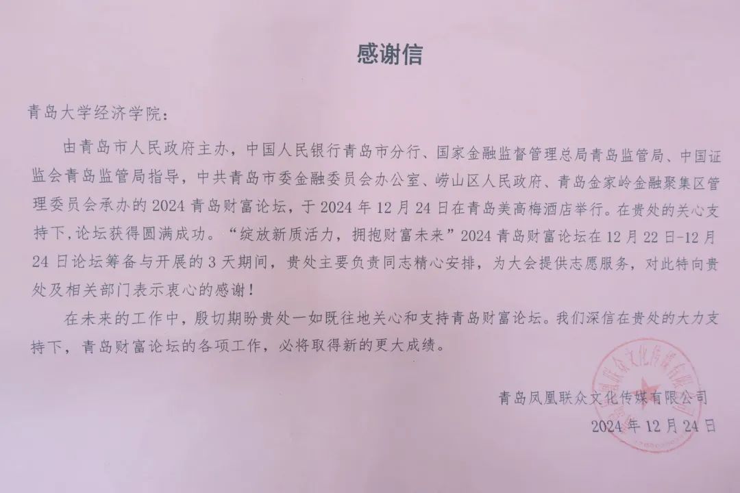近日,青岛金家岭金融聚集区管理委员会、青岛凤凰联众文化传媒有限公司送来锦旗和感谢信,对taptap点点经彩青春服务队在2024青岛财富论坛中的志愿服务表现给予高度肯定。