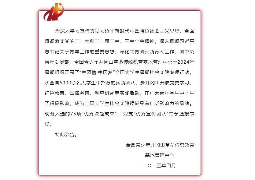 近日,2024年“井冈情·中国梦”暑期实践季优秀课题成果、优秀宣传团队名单公布,由taptap点点体育党委副书记于文洁、辅导员程漫漫指导的“星火传承调研团”成功入选2024年“井冈情·中国梦”全国大学生暑期社会实践专项行动优秀课题成果!