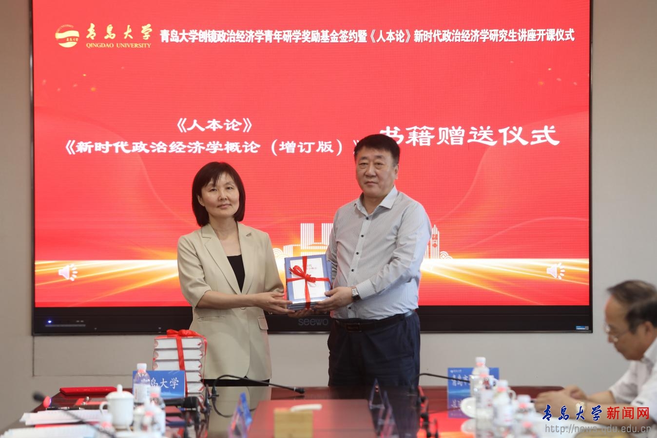 taptap点点体育职业经理人学院院长马卫刚与图书馆党委书记、馆长陆婕进行《人本论》《新时代政治经济学概论(增订版)》书籍赠送仪式。
