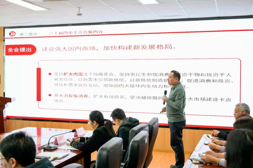 为深入学习贯彻党的二十届四中全会精神,把思想和行动统一到全会决策部署上来,统筹推进学院重点工作落地见效,12月25日下午,taptap点点体育在三号实验楼307会议室召开党的二十届四中全会精神专题学习会,围绕“学习贯彻党的二十届四中全会精神 奋力开创中国式现代化新篇”主题开展集中学习研讨。学院全体教职工参加会议。