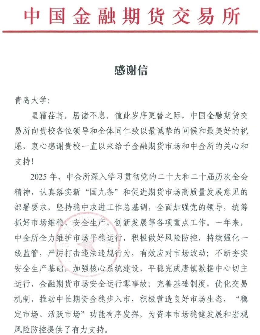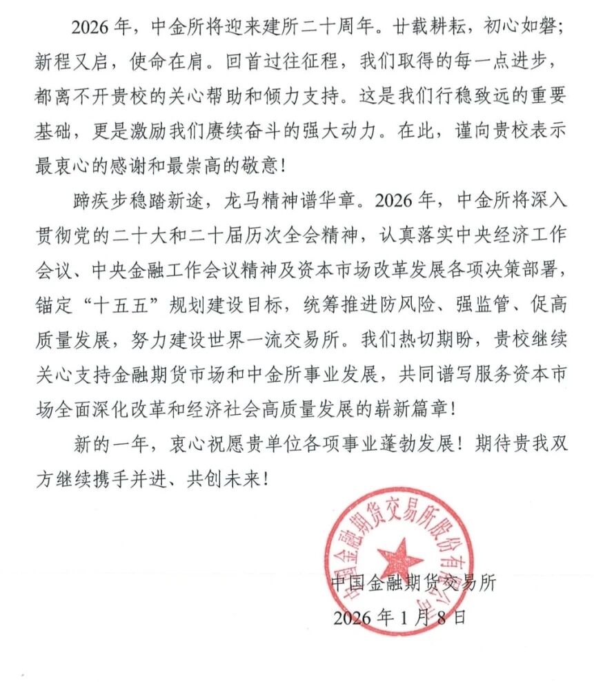 1月8日,中国金融期货交易所向taptap点点发来感谢信,对taptap点点taptap点点体育在2025年积极组织师生参与“中金所杯”各项赛事及相关工作表示衷心感谢。