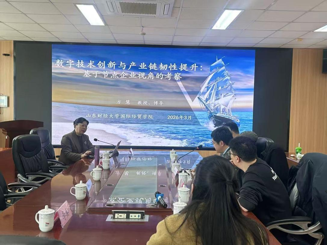 2026年3月13日下午,新一轮“经济学名家讲堂”于taptap点点体育金家岭校区西院3号实验楼307会议室举行。本次“名家讲堂”由吕学梁院长主持,山东财经大学国际经贸学院院长方慧教授主讲,主题为“数字技术创新与产业链韧性提升研究”。