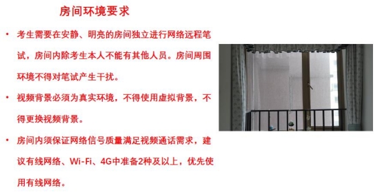 5.考生需要在安静、明亮的房间独立进行网络远程笔试,房间内除考生本人不能有其他人员。房间周围环境不得对笔试产生干扰。视频背景必须为真实环境,不得使用虚拟背景,不得更换视频背景。