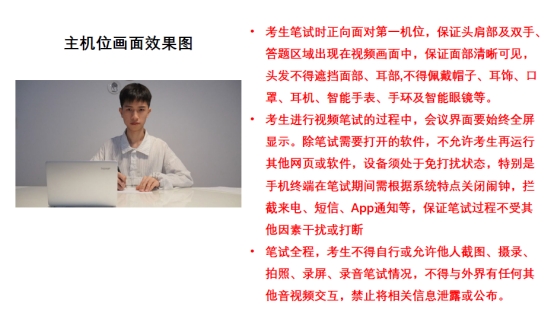 2.考生笔试时正向面对主机位,保证头肩部及双手、答题区域出现在视频画面中,保证面部清晰可见,头发不得遮挡面部、耳部,不得佩戴帽子、耳饰、口罩、耳机、智能手表、手环及智能眼镜等。辅机位须保证视频呈现考生腰部及以上部位和第一机位的屏幕图像。