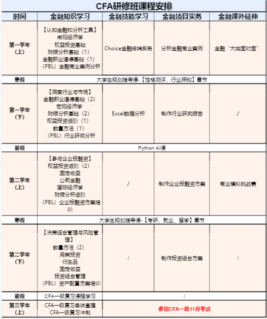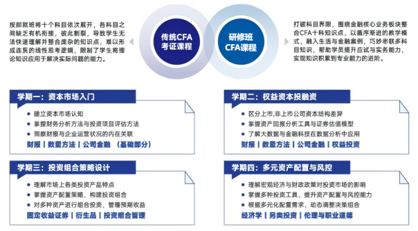 本届CFA金融研修班,在完成校内专业课程,取得学历证书的基础上,通过提供CFA知识学习+金融实务技能+金融岗前辅导等课程,帮助学生考取高含金量的职业资质认证、明确个人职业规划、提升个人求职竞争力,实现高质量就业!
