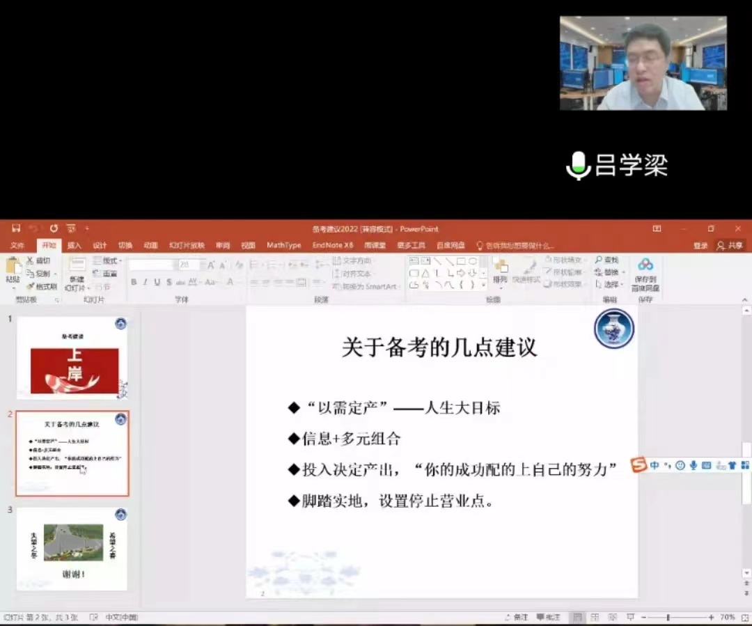 成功上岸的毕业生李一珂、尚清艺结合自身经历,分别从英语、政治和数学等公共课方面给大家进行了学习建议,告诉同学们一定要放平心态,适当运动保证身体健康。